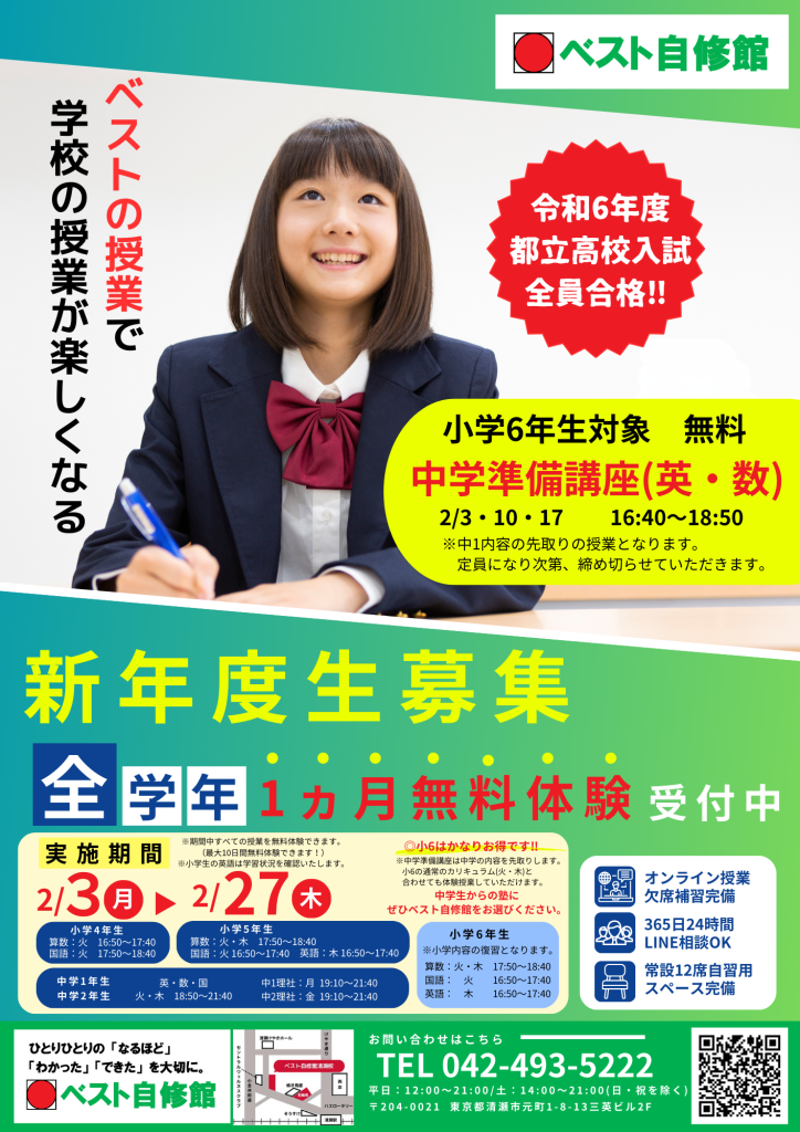 ベスト自修館清瀬校は、清瀬市で35年以上の経験と実績のある都立高校受験に強い学習塾です。