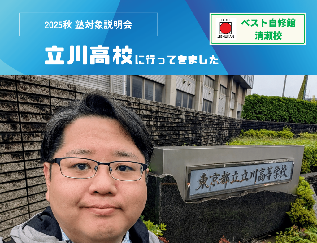 自称、清瀬市で一番高校入試情報に詳しい塾長の佐々木です!2025年10月22日(水)に開催された、立川高等学校の塾・予備校関係者対象の学校説明会に参加してきました。今年は都立自校作成校10校のうち、6つの説明会に参加しました。立川高校は5月と10月の年2回開催です!この日は今年一番の冷え込みだったので今年初めて上着を着て行ってきました!