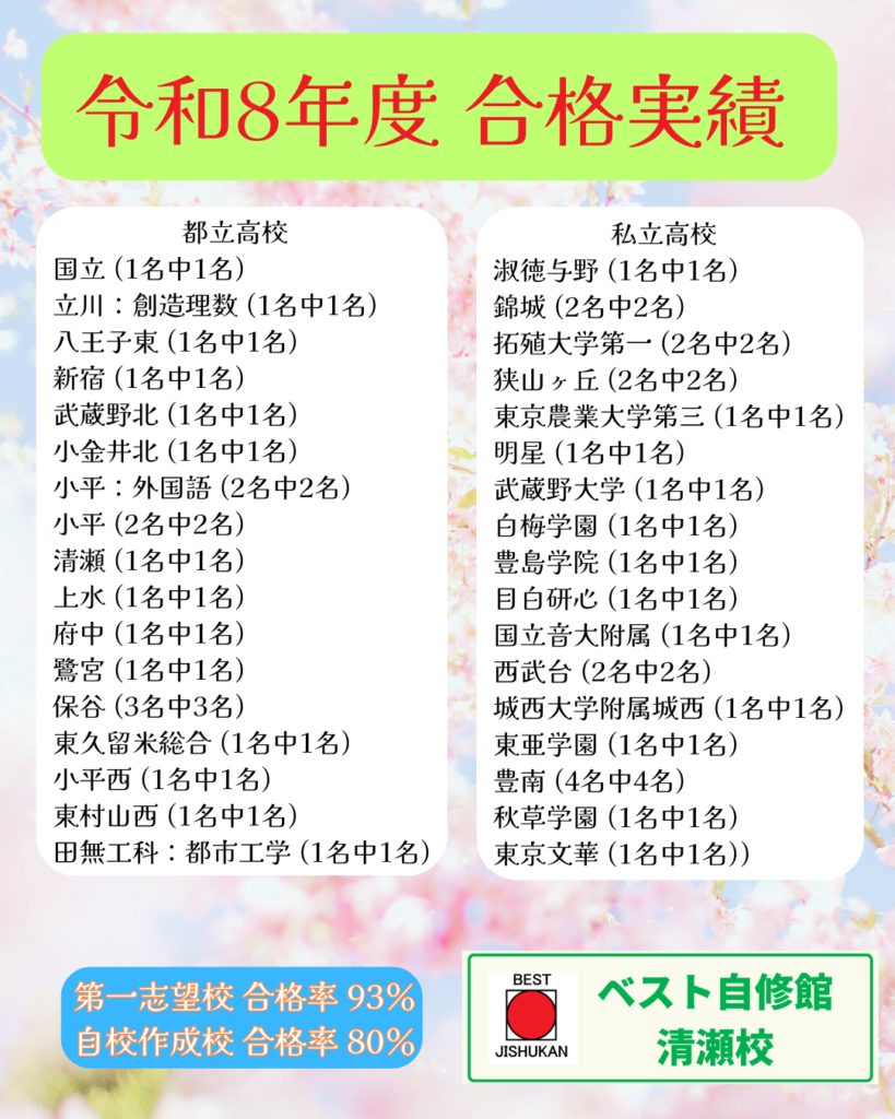 清瀬市周辺で、お子様の塾選びをされている保護者の皆様、こんにちは。ベスト自修館清瀬校 塾長の佐々木です。